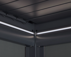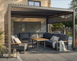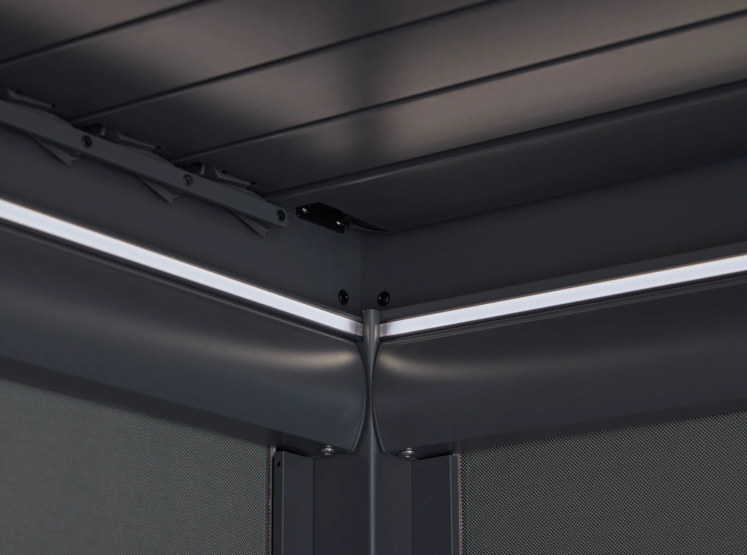 The Cube features a built-in drainage system that channels rainwater through the roof louvres and down the hollow supporting legs, ensuring a drip-free area beneath even after a shower. Optional side screens are available for all four sides, offering extra privacy and flexibility.